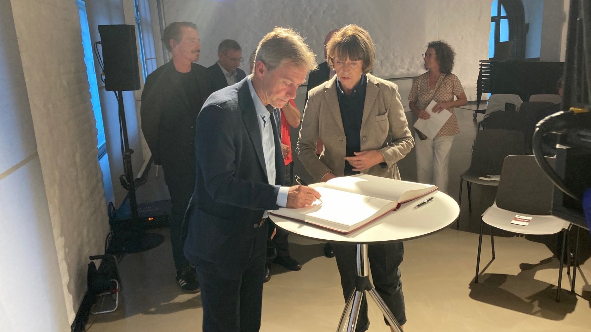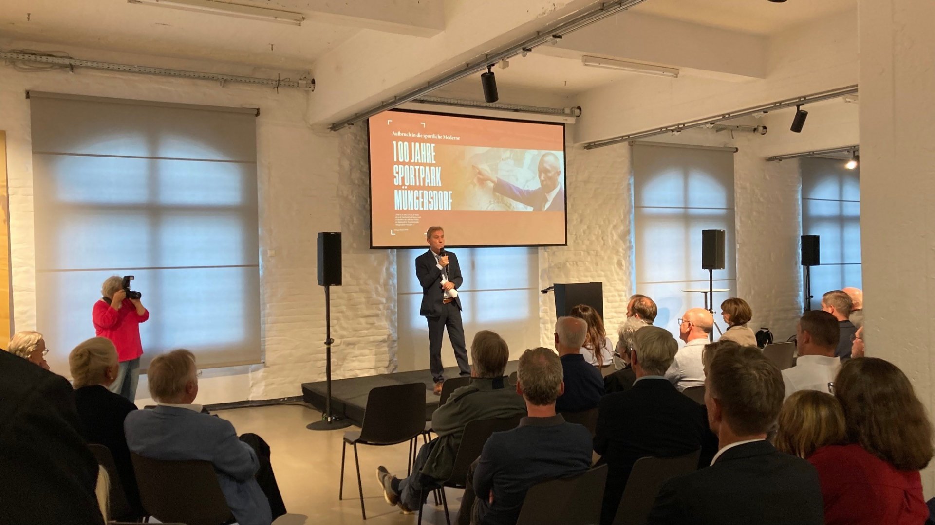 Anlässlich der Ausstellungseröffnung am 23.9. vor rund 100 Gästen stellte Filmemacher Hermann Rheindorf seine Dokumentation 100 Jahre Sportpark Müngersdorf vor. Ebenso wir er trug sich auch Museumsdirektor Dr. Andreas Höfer im Beisein von OB Henriette Reker ins Goldene Buch der Stadt ein.