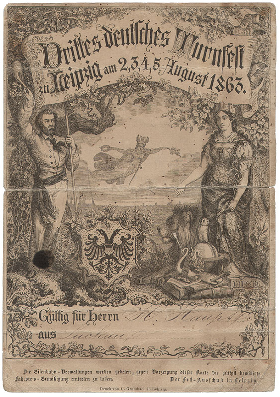 Die abgebildete Festkarte stammt vom „Dritten Deutschen Turnfest“, das vom 2. bis 5. August 1863 in Leipzig stattfand. Es handelt sich um eine Teilnehmerkarte oder Eintrittskarte, die handschriftlich personalisiert ist („Gültig für Herrn H. Haupt aus Luchau“). Die Karte diente nicht nur als Legitimation zur Teilnahme, sondern auch als Nachweis für Vergünstigungen, wie es im unteren Bereich explizit erwähnt wird: „Die Eisenbahn-Verwaltungen werden gebeten, gegen Vorzeigung dieser Karte die günstig bewilligte Fahrpreis-Ermäßigung eintreten zu lassen.“