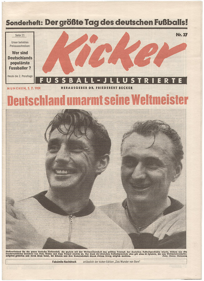 Faksimile-Nachdruck der Fußball-Illustrierten „Kicker“ vom 5. Juli 1954. Einen Tag nach dem sensationellen 3:2-Finalsieg der deutschen Nationalmannschaft über Ungarn bei der 5. FIFA-Fußball-Weltmeisterschaft in der Schweiz erschien das Sportmagazin mit der Titelzeile „Deutschland umarmt seine Weltmeister“. Abgebildet sind jubelnde deutsche Spieler, die den Triumph im Berner Wankdorfstadion verkörpern.