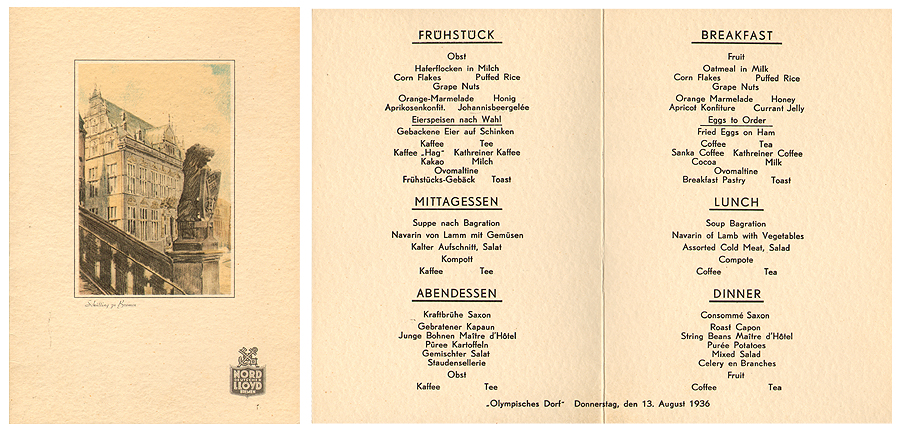 Die Speisekarte stammt aus dem Olympischen Dorf der XI. Olympischen Spiele 1936 in Berlin und ist auf den 13. August 1936 datiert. Die Verpflegung der Athletinnen und Athleten wurde vom Bremer Schifffahrtsunternehmen Norddeutscher Lloyd organisiert, das eigens für die Spiele einen auf die Vorlieben der unterschiedlichen Nationen abgestimmten Speiseplan entwickelte.